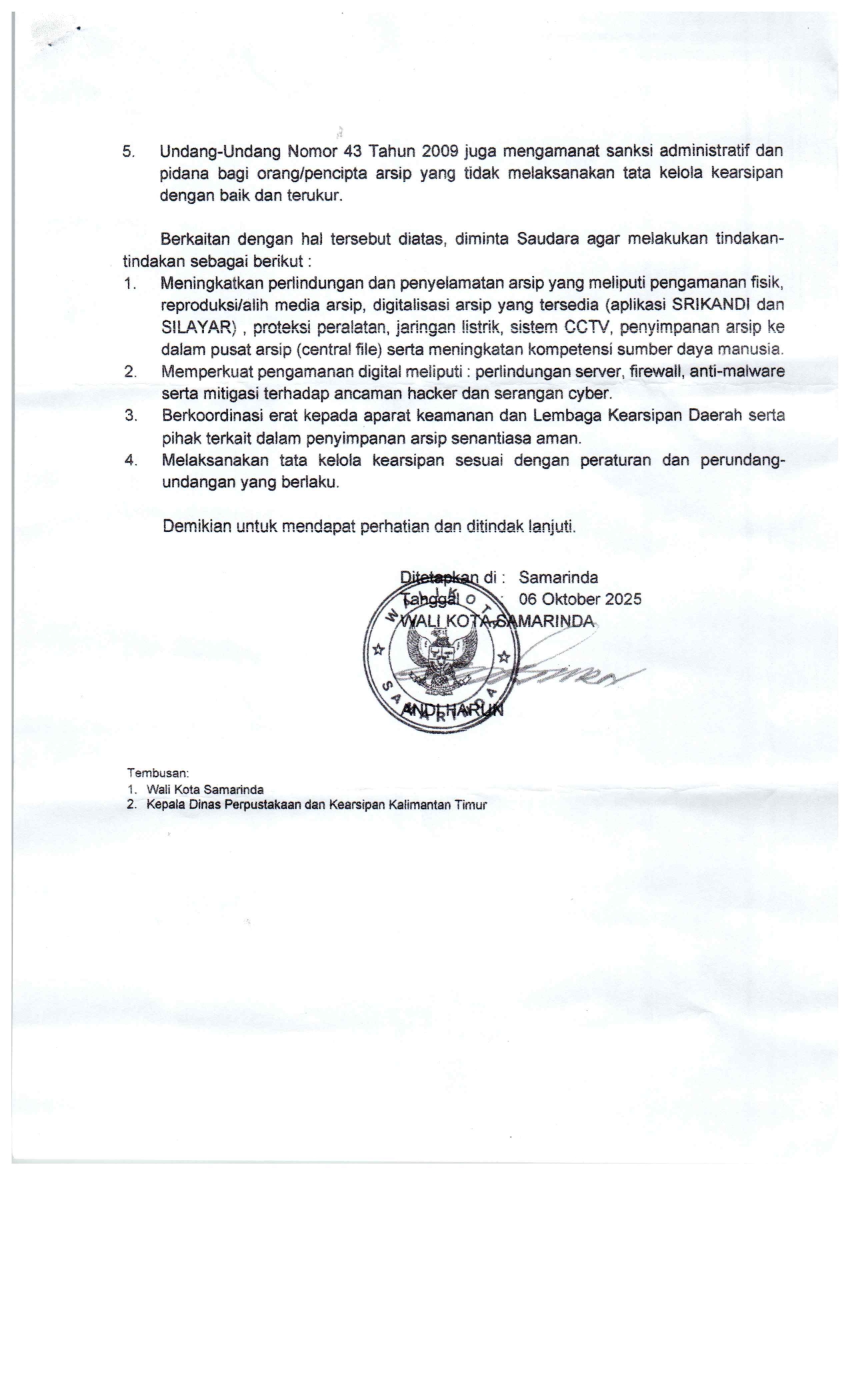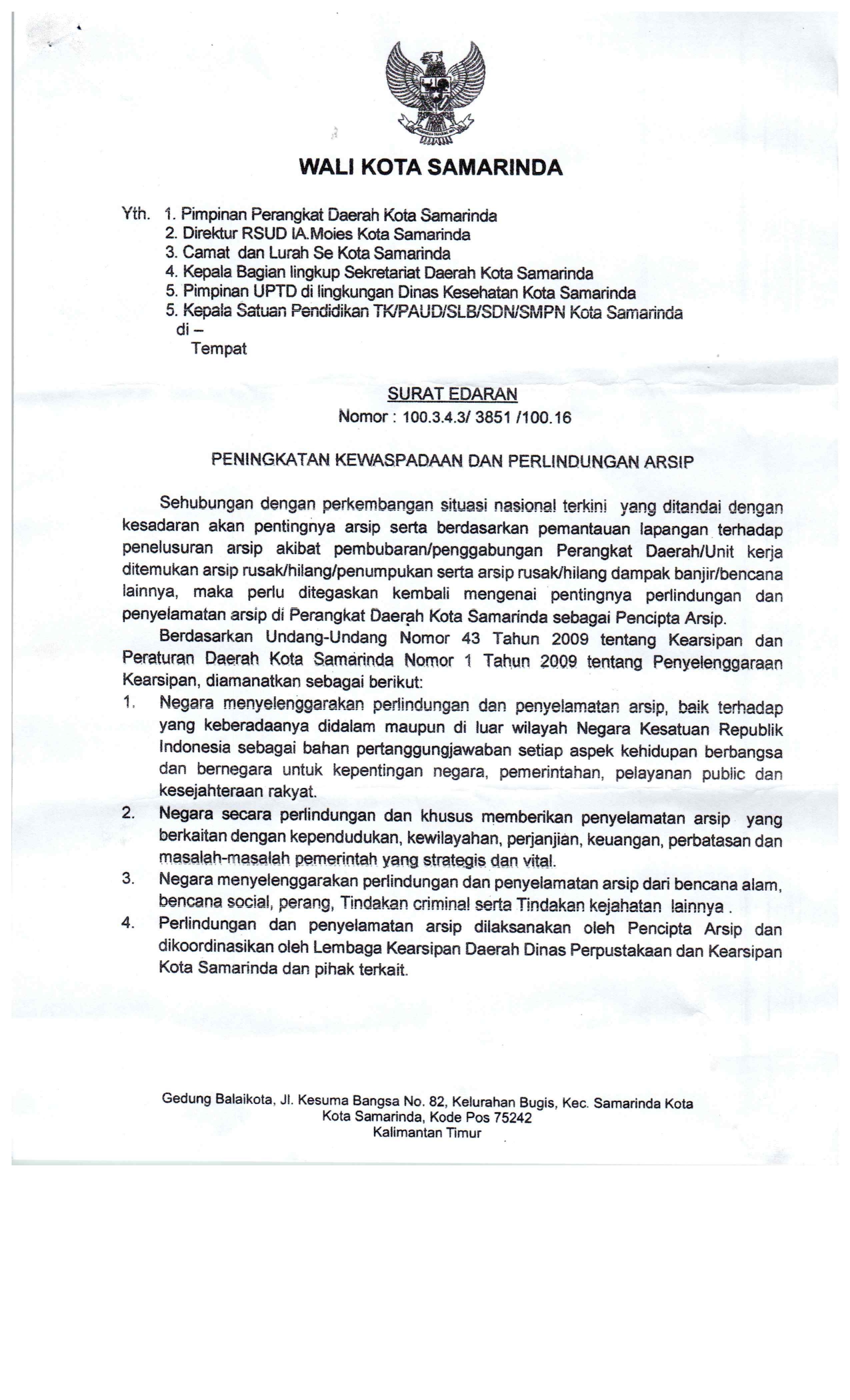 Surat Edaran Peningkatan Kewaspadaan dan Perlindungan Arsip